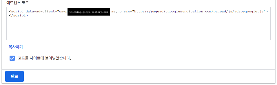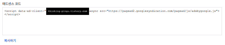 "애드센스 코드" 칸 안에 있는 코드를 복사해주세요.