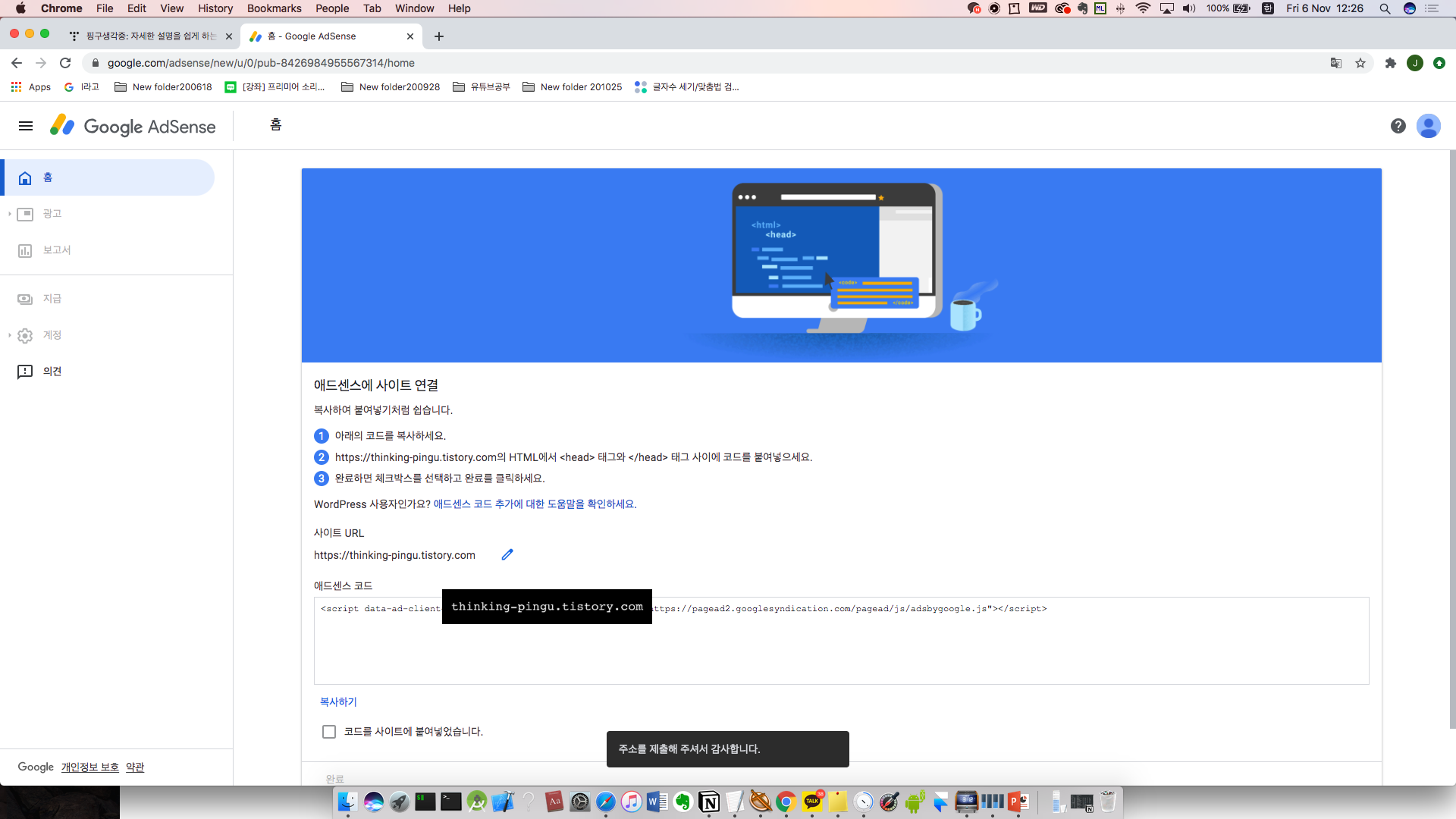 애드센스 신청이 완료되었으니