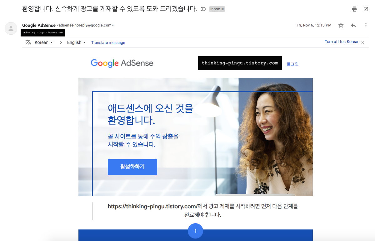 빨리 애드센스 시작하라고 메일도 두 통이나 더 와있더라고요.
