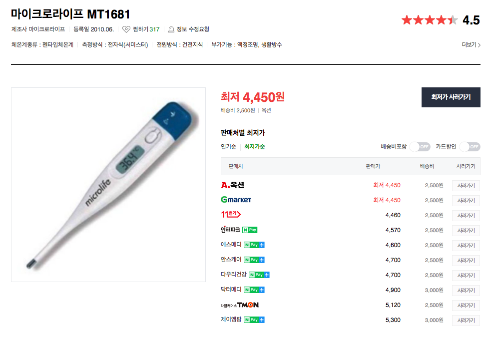 [마이크로라이프 체온계] 저렴한 접촉식 체온계. 정확도 나쁘지 않음. 가격, 사용법.