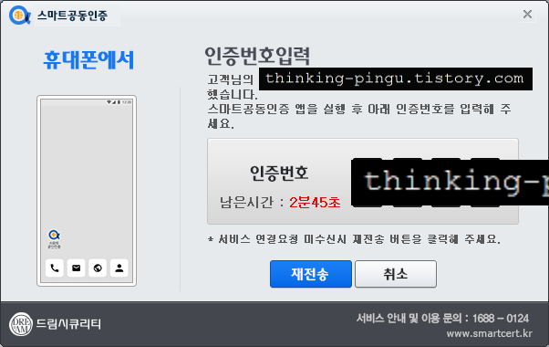 이어서 뜨는 인증번호 창에서 인증번호 입력하시면 됩니다.