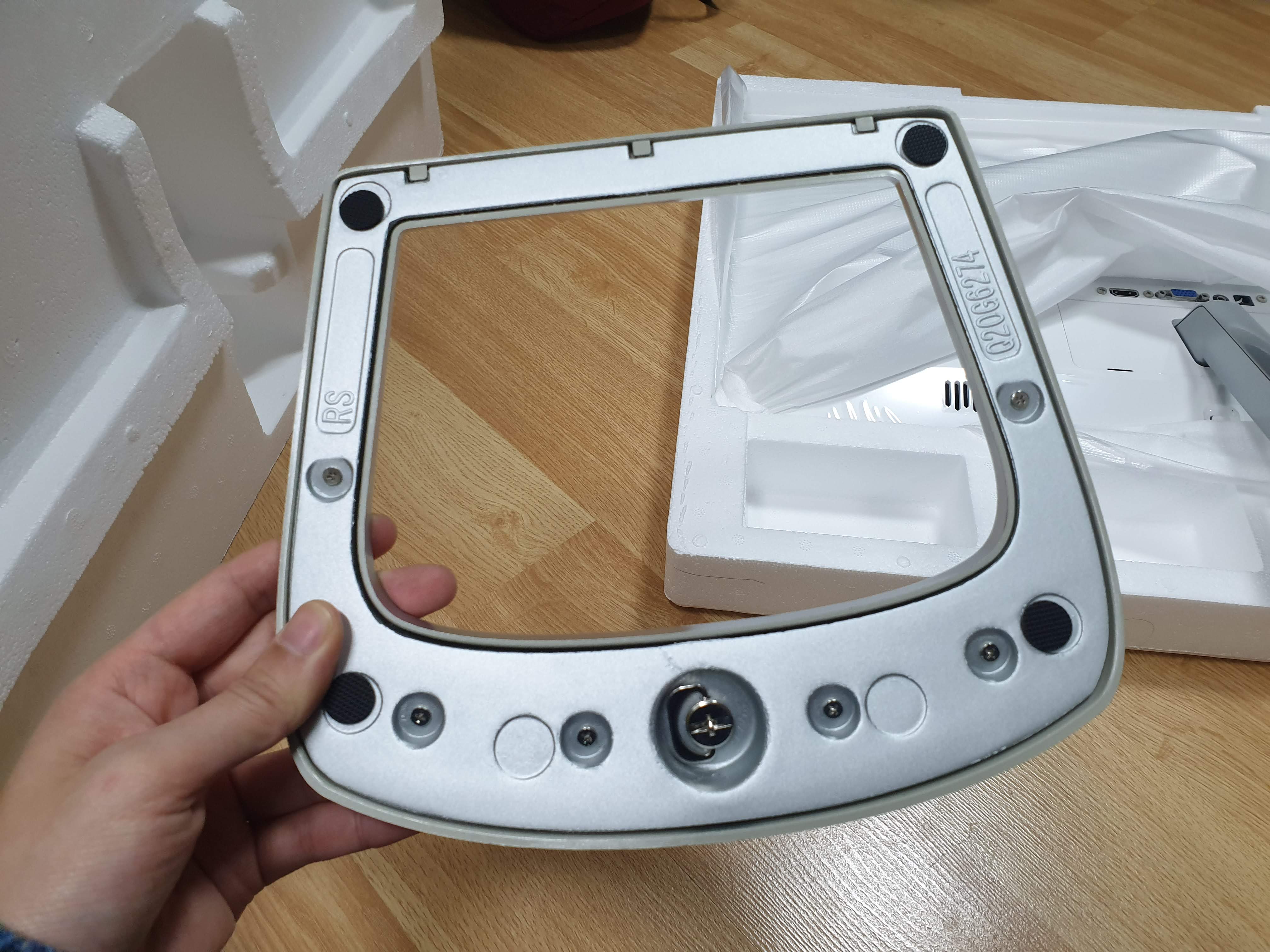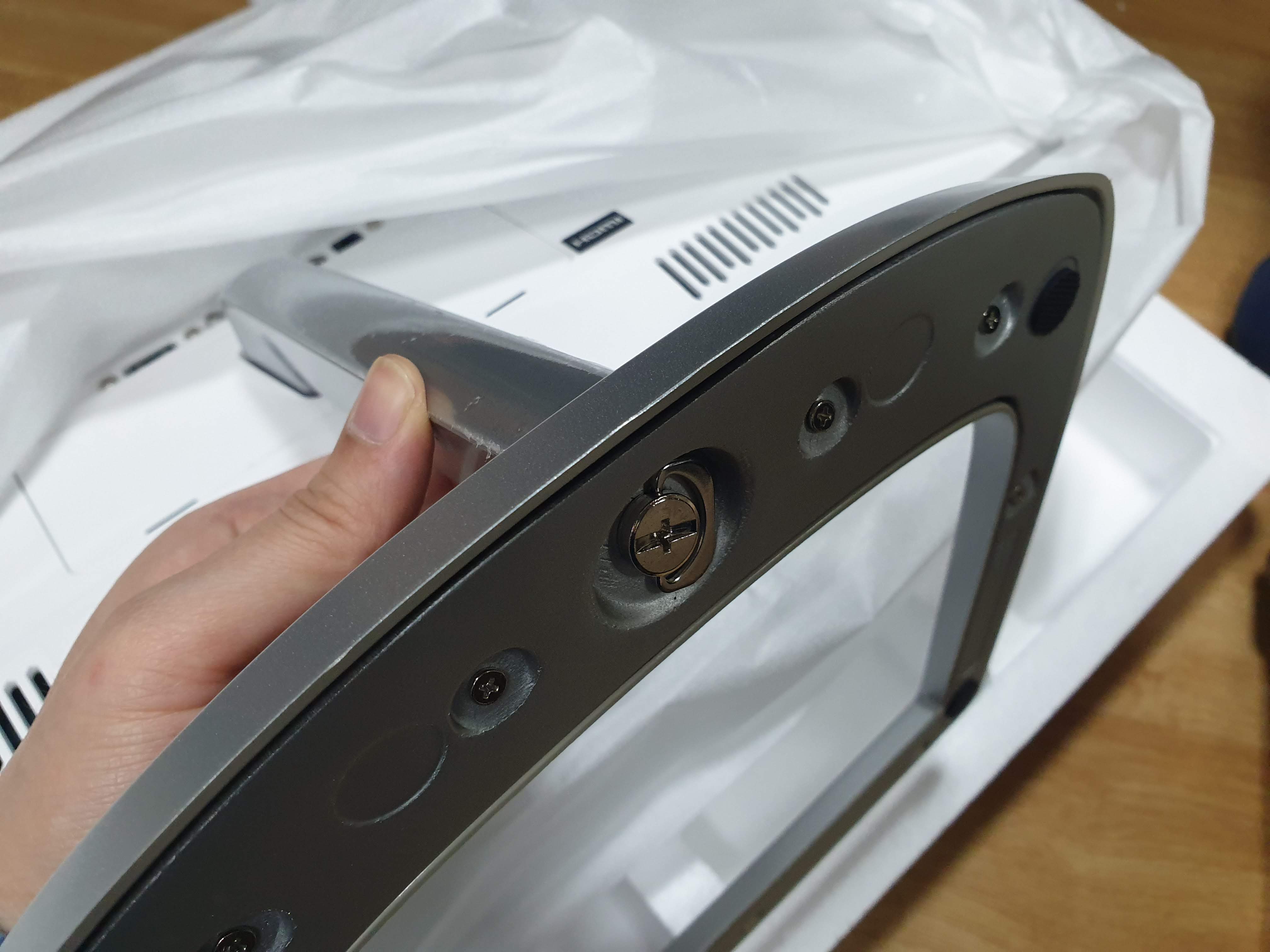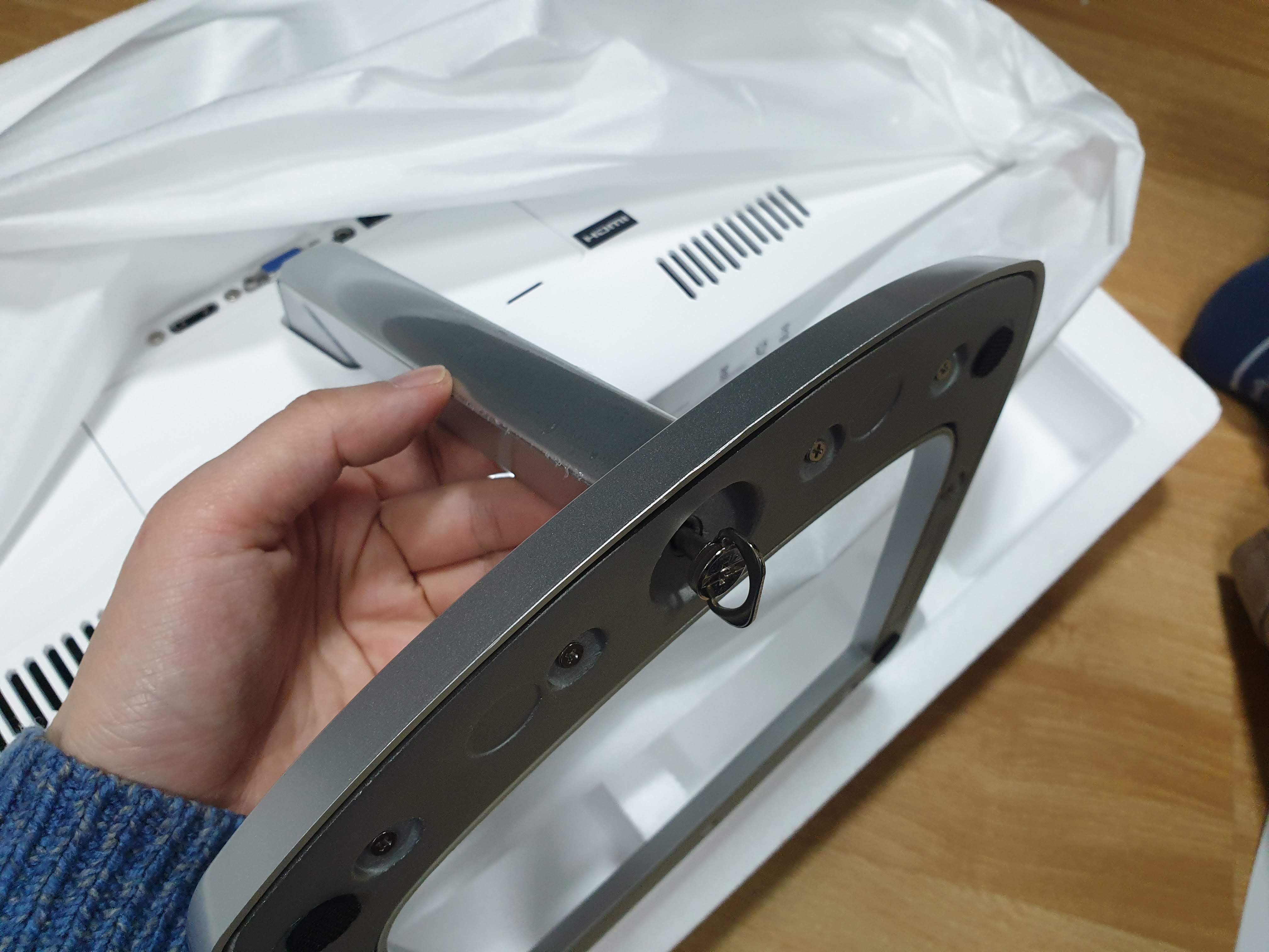 모니터 받침대는 따로 들어있으니 그걸 이 모니터의 목? 아래에다가 끼워주면 됩니다.