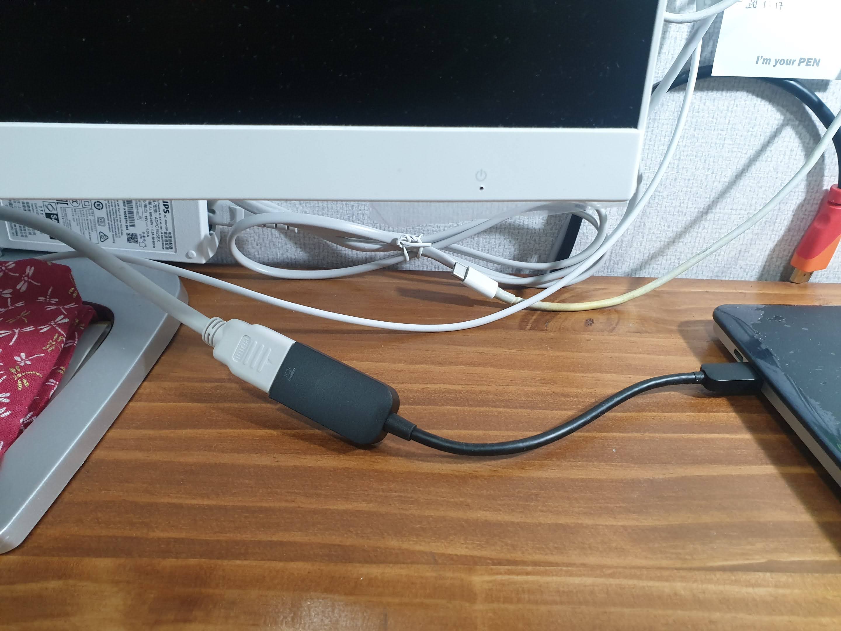 좌측부터 모니터 -> HDMI to HDMI 케이블 -> USB-C to HDMI 젠더 -> 컴퓨터 순서입니다.